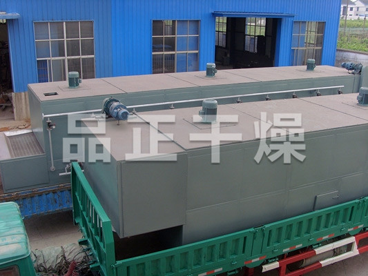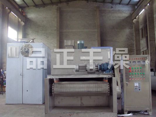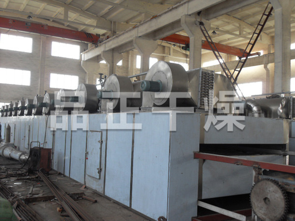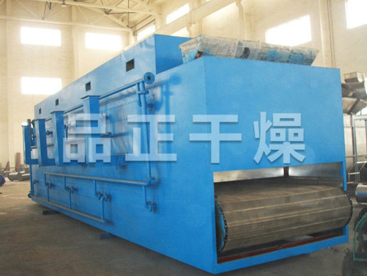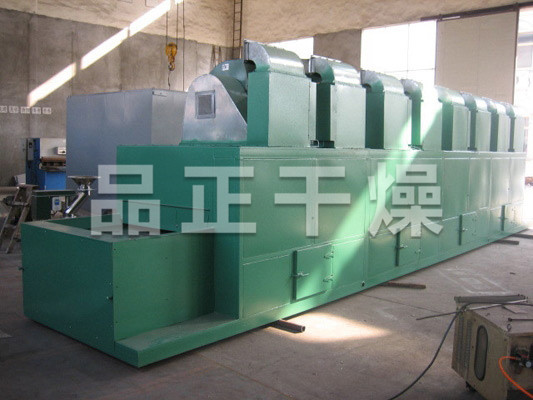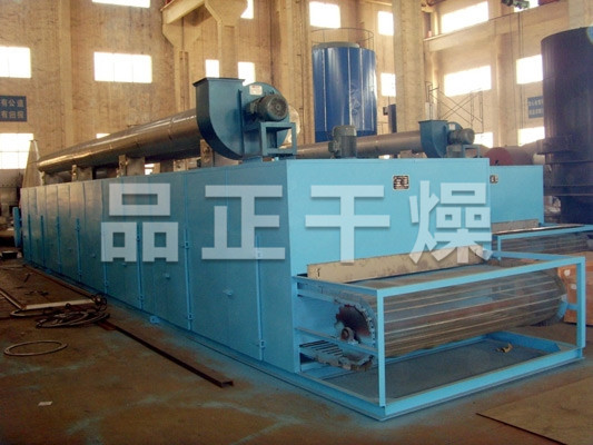 物料由加料器均勻地鋪在網(wǎng)帶上,網(wǎng)帶一般采用12-60目不銹鋼絲網(wǎng),由傳動裝置拖動在干燥機內(nèi)移動。干燥機由若干單元組成,每一單元熱風(fēng)獨立循環(huán),部分尾氣由專門排濕風(fēng)機排出,廢氣由調(diào)節(jié)閥控制,熱氣由下往上或由上往下穿過鋪滿物料的網(wǎng)帶完成熱量與質(zhì)量傳遞的進程,帶走物料水份。網(wǎng)帶緩慢移動,運行速度可根據(jù)物料溫度自由調(diào)節(jié),干燥后的成品連續(xù)落入收料器中。上下循環(huán)單元根據(jù)用戶需要可靈活配備,單元數(shù)量亦可根據(jù)需要選取。