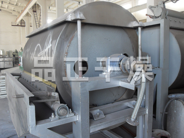 滾筒干燥機是一種內加熱傳導型轉動連續干燥設備。旋轉的滾筒通過其下部料槽,粘附著一厚度的料膜,熱量通過管道輸送至滾筒內壁,傳導到滾筒外壁,再傳導給料膜,使料膜中的濕得到蒸發、脫濕,使含濕分的物料得到干燥。干燥好的物料被裝置在滾筒表面的刮刀鏟離滾筒,到置于刮刀下方的螺旋輸送器,通過螺旋輸送器將干物料集中、包裝。