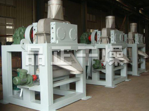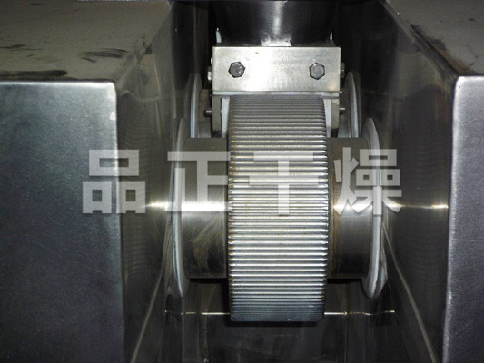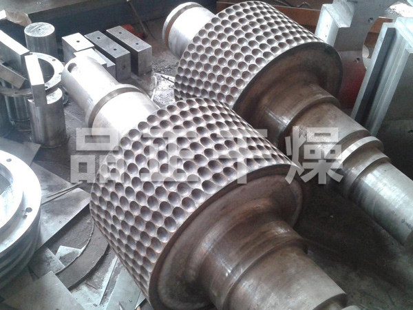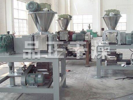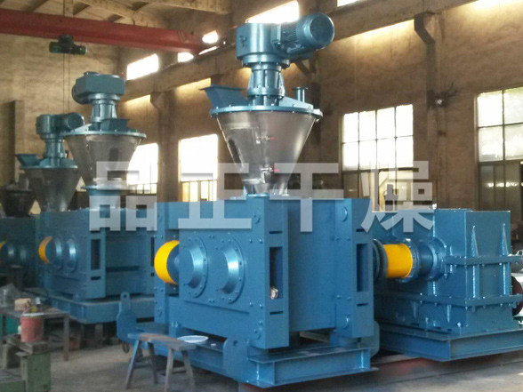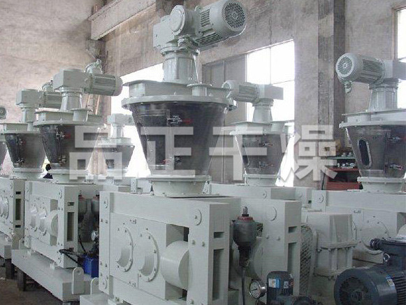 擠壓造粒的形式可以有對輥式和輪輾式兩種,對輥式擠壓是先壓成大塊,再破碎成顆粒,這樣裝置的能力大、顆粒強度高、能耗低,對輥擠壓在國外使用廣泛。輪輾式是在輥表面直接做成有穴槽型的形狀,一次擠成成型顆粒。產品強度較低有時需添加粘結劑。適合做有機肥和復合肥等顆粒肥料。