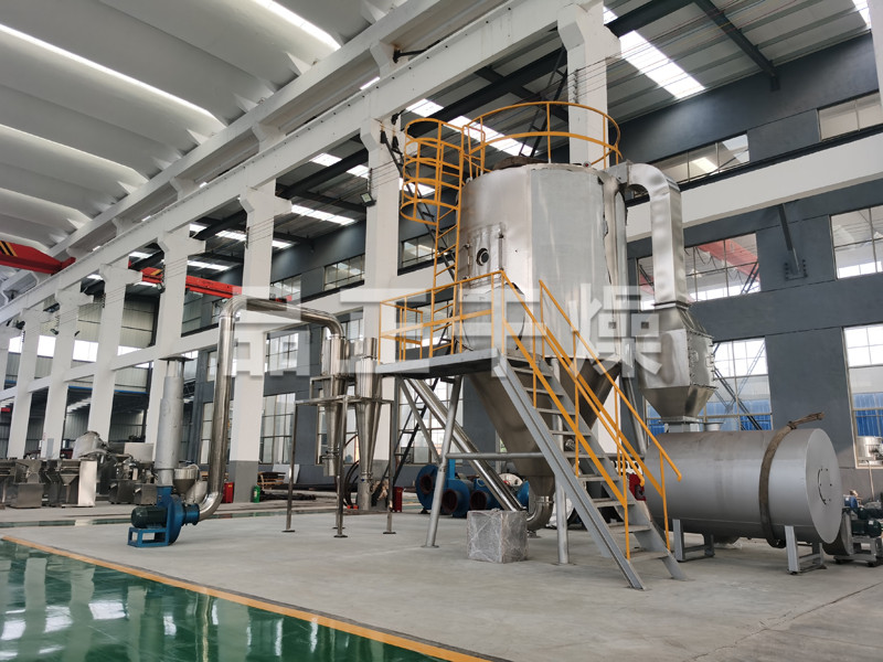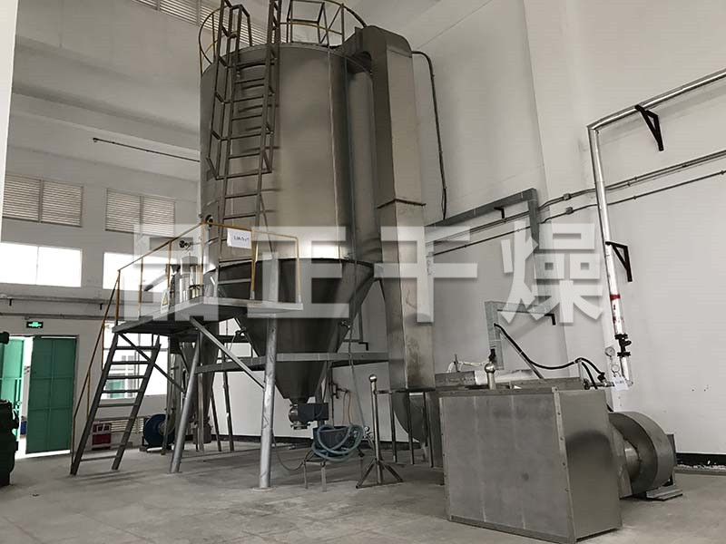 空氣經過濾和加熱,進入干燥器頂部空氣分配器,熱空氣呈螺旋狀均勻地進入干燥室。料液經塔體頂部的高速離心霧化器,(旋轉)噴霧成極細微的霧狀液珠,與熱空氣并流接觸在極短的時間內可干燥為成品。成品連續地由干燥塔底部和旋風分離器中輸出,廢氣由風機排空。