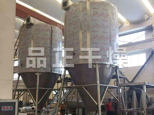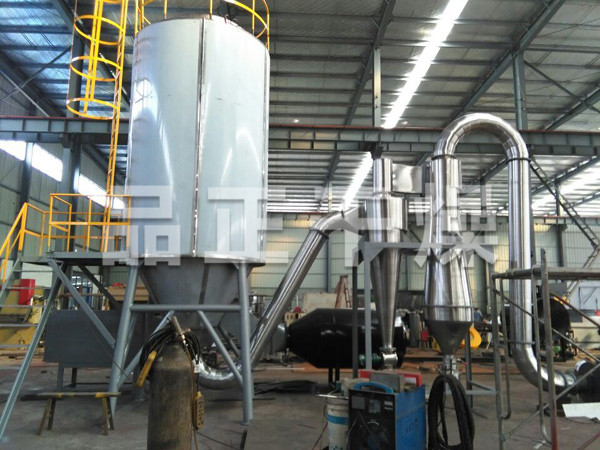 本機(jī)組工作過程為料液通過隔膜泵高壓輸入,噴出霧狀液滴,然后同熱空氣并流下降,大部分粉粒由塔底排料口收集,廢氣及其微小粉末經(jīng)旋風(fēng)分離器分離,廢氣由抽風(fēng)機(jī)排出,粉末由設(shè)在旋風(fēng)分離器下端的授粉筒收集,風(fēng)機(jī)出口還可裝備二級除塵裝置,回收率在96-98%以上。