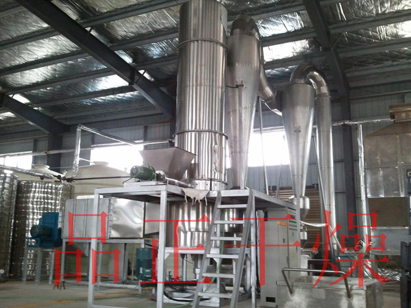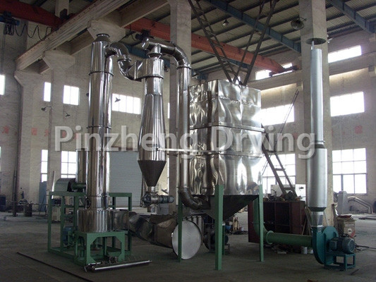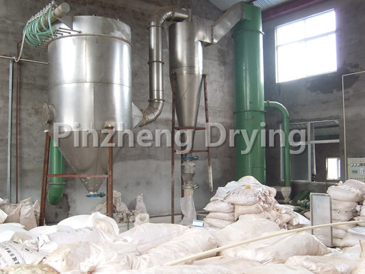 The hot air tangent enters the bottom of the dryer and forms a strong rotating wind field driven by the agitator. The paste material enters the dryer through the screw feeder. Under the strong action of the high-speed rotating agitator, the material is dispersed under the impact, friction and shear force. The block material is quickly crushed, fully contacted with the hot air, heated and dried. The dehydrated dry material rises with the hot air flow, the grading ring intercepts the large particles, and the small particles are discharged from the center of the ring outside the dryer, and recycled by the cyclone separator and dust collector. The dry or large materials are thrown to the wall by centrifugal force, and then fall back to the bottom for crushing and drying.